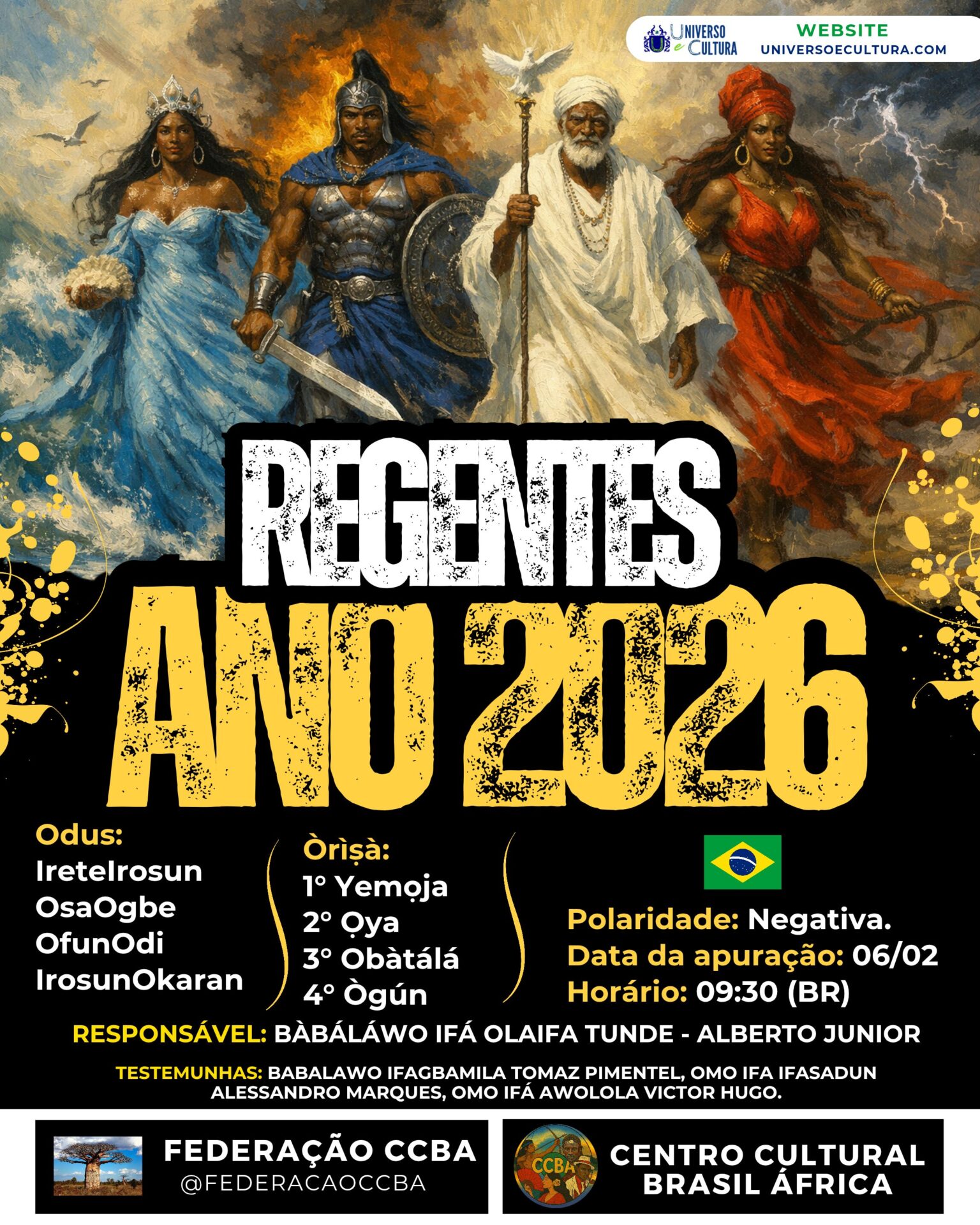 Às 09h30, horário de São Paulo, na presença das seguintes testemunhas: Bàbáláwo Ifagbamila Tomaz Pimentel, Omo Ifá Ifasadun Alessandro Marques e Omo Ifá Awolola Victor Hugo, o Bàbáláwo Ifa Olaifa Alberto Junior, dirigente do Centro Cultural Brasil África, realizou o jogo do ano de 2026. De forma tradicional, foram oralizadas as seguintes interpretações: